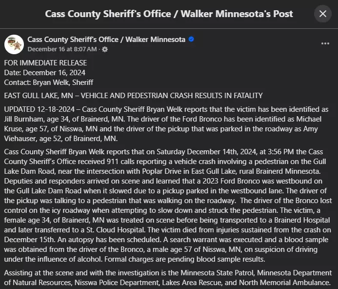 The Brainerd woman was taken to St. Cloud Hospital and later died of her injuries, according to the Cass County Sheriff’s Office. 57-year-old Michael Kruse of Nisswa was identified as the driver that struck Burnham.