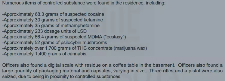 Investigators executed the search warrant at the home on Thursday and seized over 3,000 grams of suspected drugs, the complaint indicates.